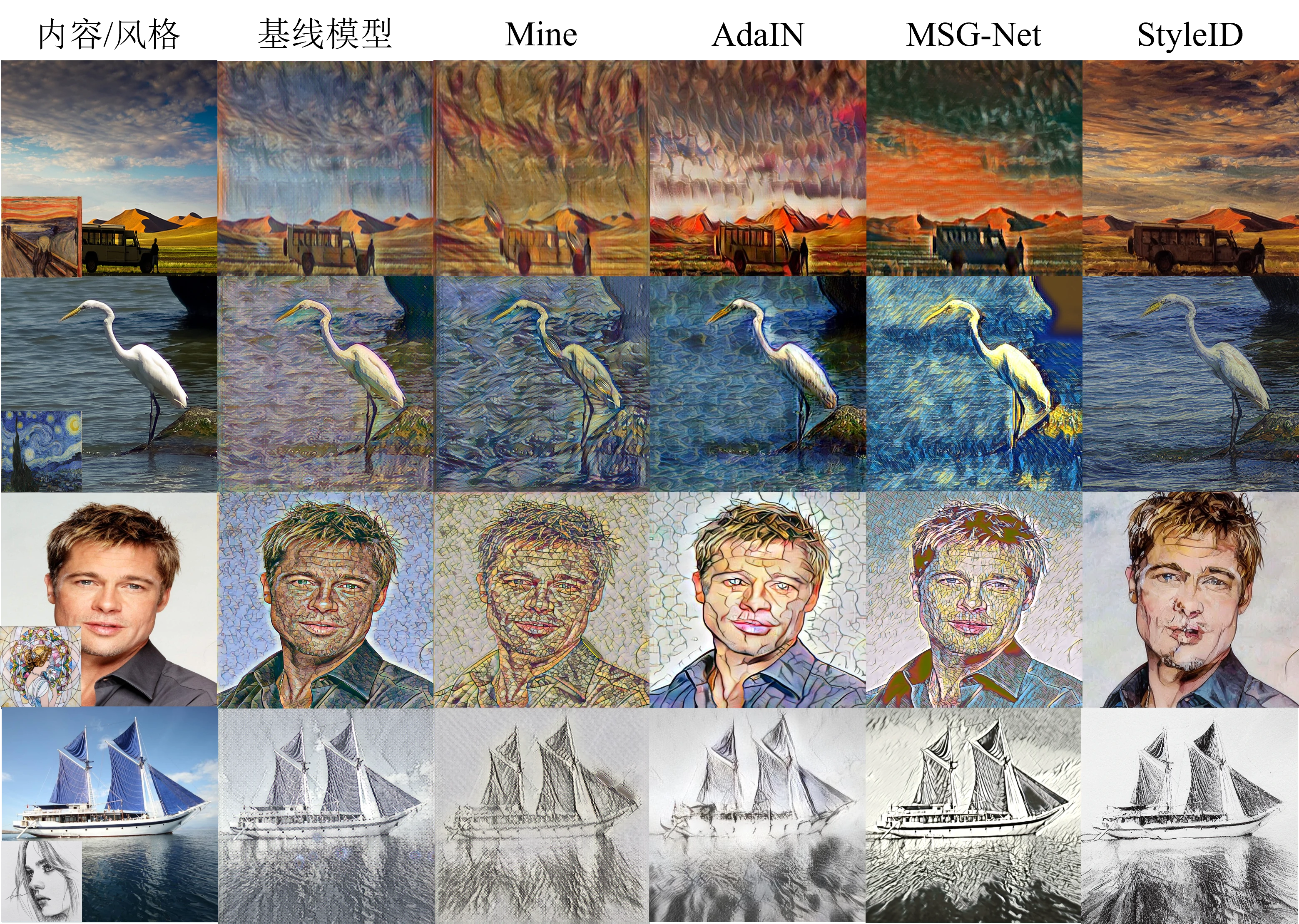 本小节对多个模型展开横向对比分析,进行对比的模型包括基线模型、本文改进模型、AdaIN方法、MSG-Net方法以及StyleID方法[39]。